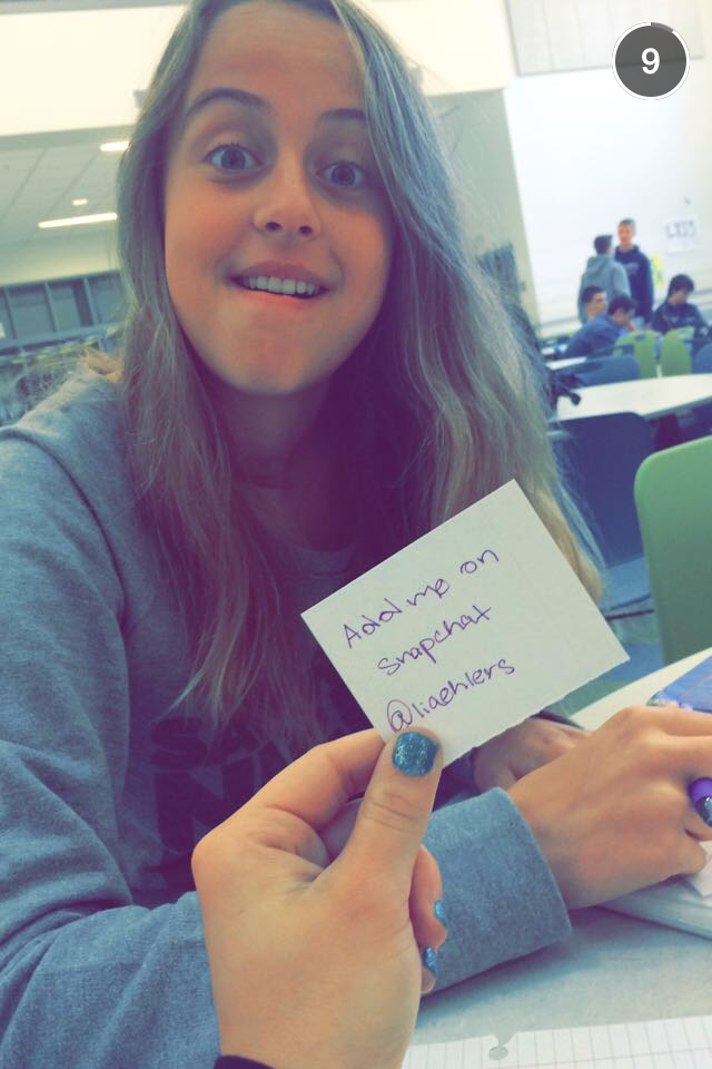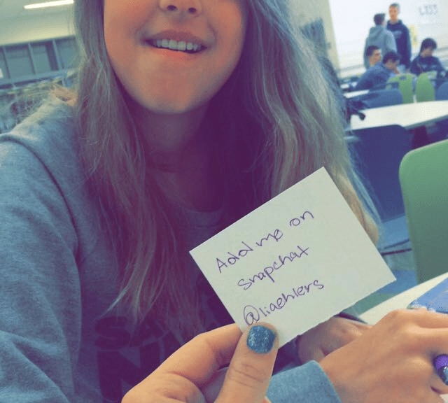 On November 1, 2014, Ehlers was in gym class when she decided she wanted to meet some new people by getting them to add her on Snapchat. She tookimage2 over 100 index cards, cut them in half, and wrote “add me on Snapchat @liaehlers” on each card. She handed them out, taped them up in the school, wrote it all over whiteboards, and got the word out about her Snapchat account. Before she knew it, all different people started adding her on Snapchat. Upperclassmen she had never even talked to were looking up her username on the app.