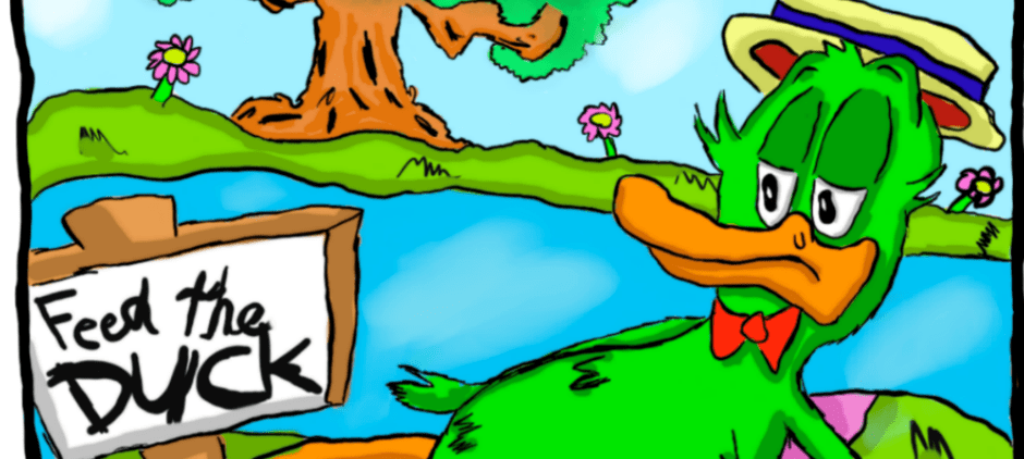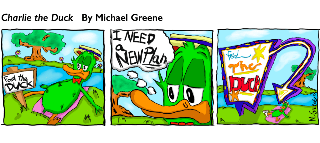 I really like the colors vibrant colors that you used in this cartoon. It creates a happier atmosphere inside of the art. I also like the comical aspect of this piece of art. The dramatic switch from the small unnoticeable sign to the big bright sign highlights this. Most of all, I liked how Charlie, despite being a cartoon duck, is given character. A laid back, lazy duck, who sits in the sun and waits to be fed.