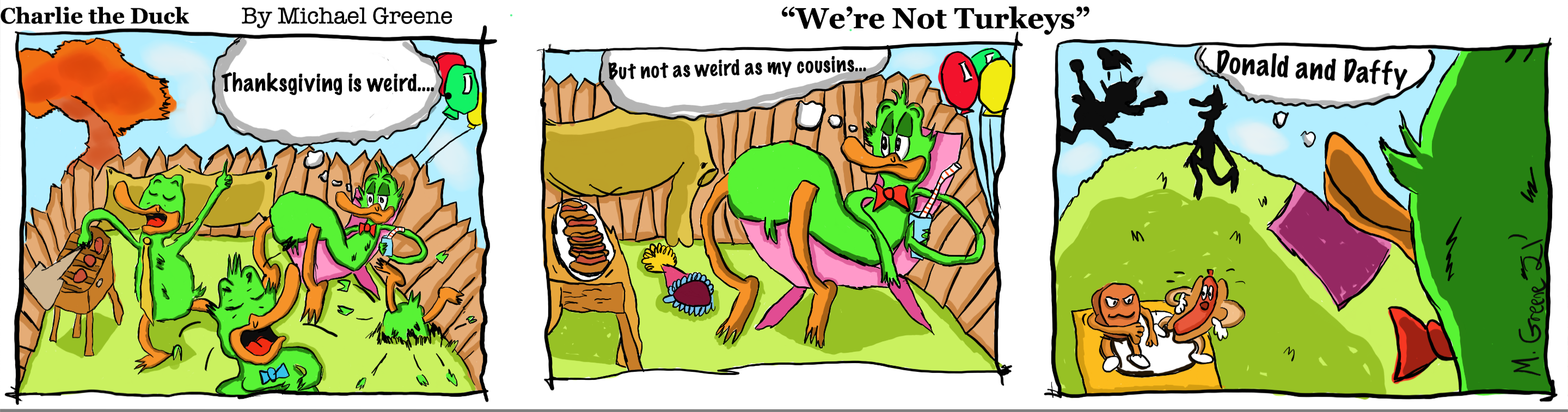 I thought the comic, Charlie the Duck, was really funny. I feel like I never get to read comics anymore, so I liked how this was different. The illustrations were really colorful and made the whole comic even better. I like the expressions of the ducks face as well.