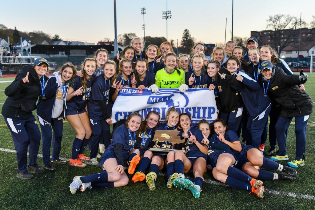 Flying high from their Patriot League Fisher Division championship, the team kicked off the post-season by edging Martha’s Vineyard (#29) at home Nov. 6 by a score of 2-1. Goals were netted by Foley, a league MVP, and Sophie Schiller. The team next hosted Pentucket Regional (#13) in the round of 16 on Nov. 9, winning by a score of 2-0. Foley and Schiller combined for scoring once again. The Hawks beat North Reading 1-0 in double overtime in the round of 8 on Nov. 12 to secure a spot in the Final Four. Ayla McDermod scored the winning goal and Pongratz continued her outstanding work in goal. They qualified for the state championship after topping Dover-Sherborn (#8) in the Final Four. The game, played Nov. 16 at Weymouth High School, was scoreless through two overtimes before Hanover won on penalty kicks. Natalie Mutchler defended the goal and Callie Baldwin sank the winning shot.