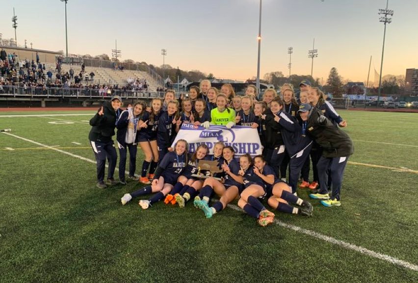 Girls Soccer – The Hawks (#4) won their first state title in 20 years after beating Dedham (#12) 1-0 in the title game at Walpole High School on Nov. 19. Sophia Foley scored the winning goal on a pass by Eva Kelleher, and the team survived a penalty kick in the final minutes. Led by senior captains Mary Carven, Cailyn McCarthy and goalie Mia Pongratz, the game was a fitting end to an amazing season!