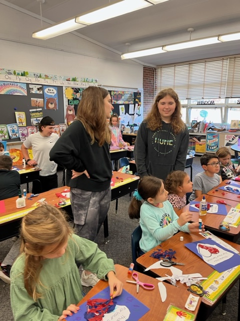 Students in the Hanover High School Outreach Club worked with first graders at Cedar School on Monday, Nov. 7, to create crafts in honor of Veterans Day. The finished projects were handed out to veterans at the holiday lunch at the Hanover Council on Aging on Nov. 11.
