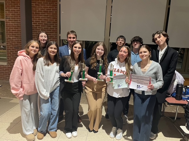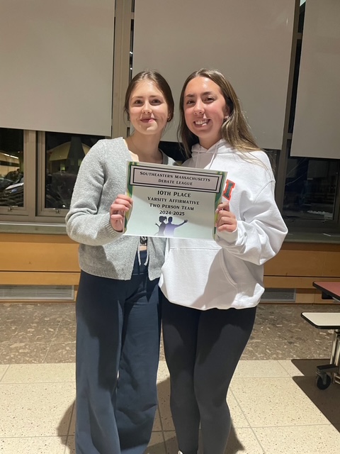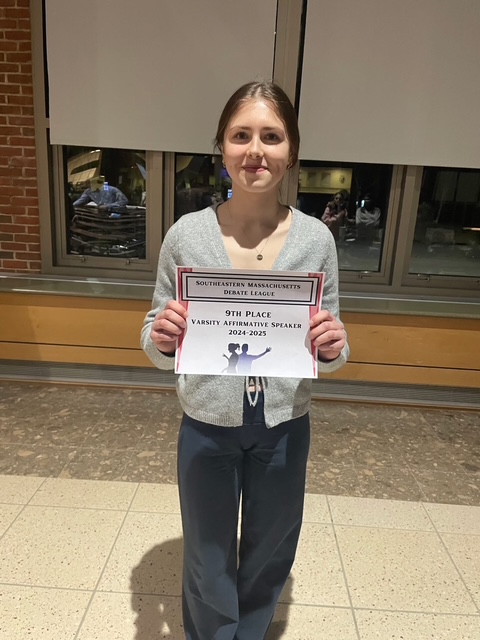 The Hanover High Debate Team racked up an impressive number of wins and awards in the Eastern Mass Debate League Competition. At the final debate and awards ceremony at Bridgewater-Raynham High School on Feb. 26, four out of five varsity debate pairs won their final rounds. Even better, several students earned league awards for outstanding performance for the entire season. Junior Alana Cole took home first place among all individual varsity speakers; junior Ava Khouri won second and junior Abbey Corbo grabbed third. Sophomore Sam Frattasio earned 5th place and Senior Ruby Telepak finished 9th. Among two-person varsity affirmative teams who scored the highest for the season, Cole and Corbo won third place and Telepak and Khouri finished 10th. The HHS team is coached by Mrs. Allyson Gately.