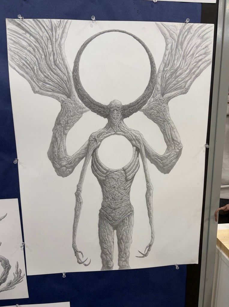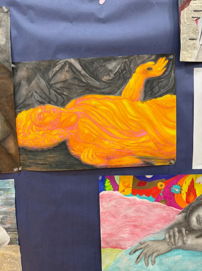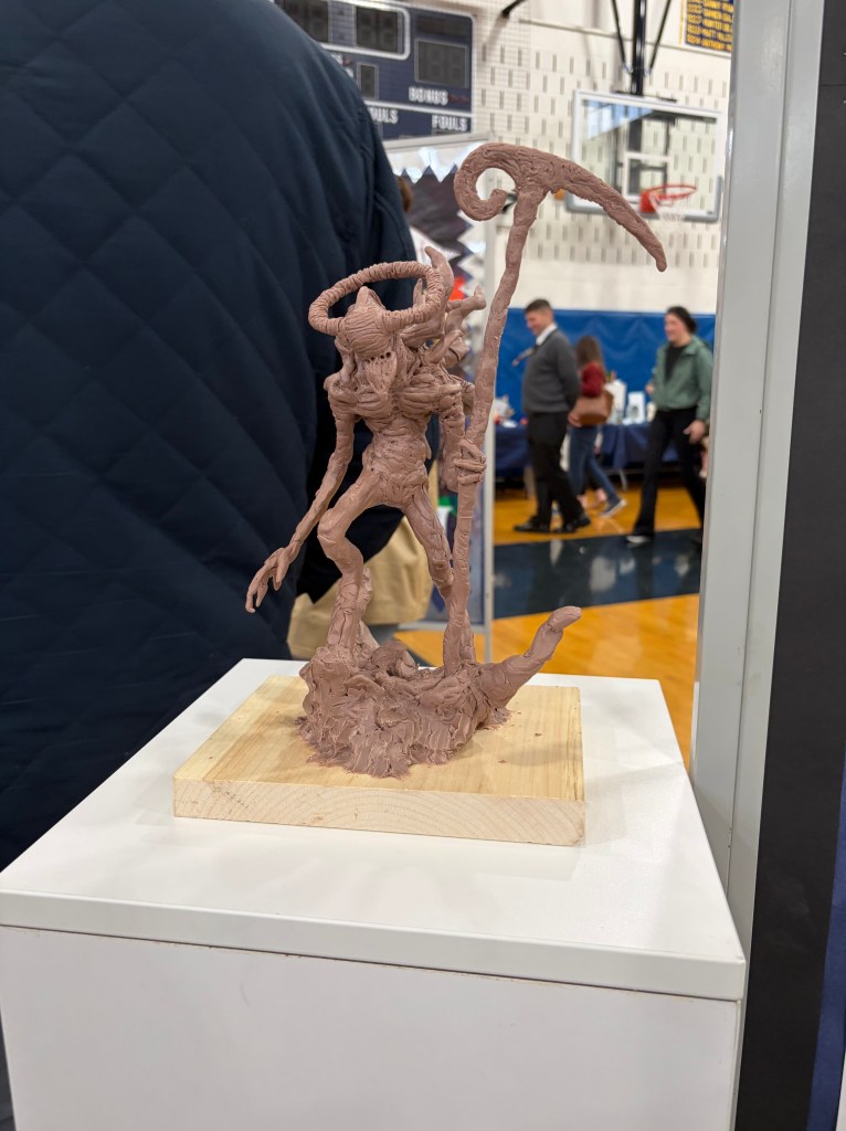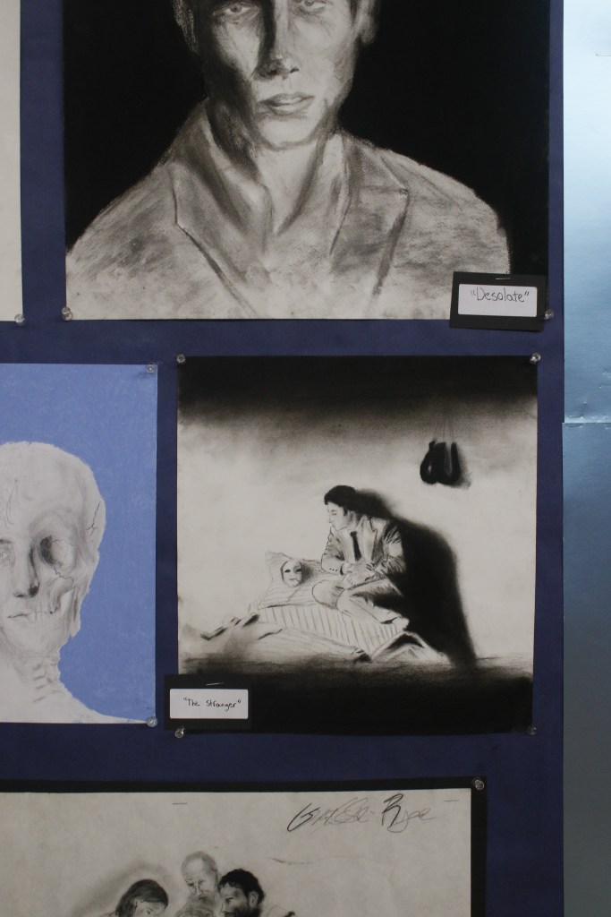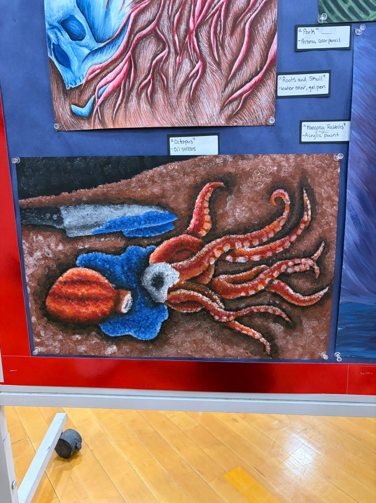 Another impressive display was presented by Owen Cleary, a junior in AP Art. Owen captivated viewers with his hyperrealistic depictions of supernatural creatures, having spent days perfecting each piece to the most minute detail. These pieces were inspired by some of his favorite video games and horror films.