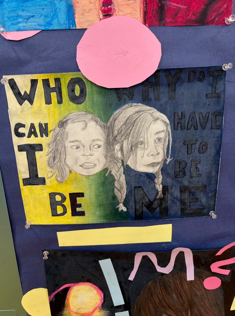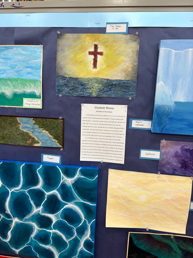 Many artists also explored existentialism and the human relationship with nature. Senior AP artist Elizabeth Winnie used acrylic paints to express how the ocean can evoke varying emotions in people based on their individual perspectives. Senior Bella Telepak depicted the duality of death and the absence of consideration for nature’s creatures using her expressive mixed media artwork.