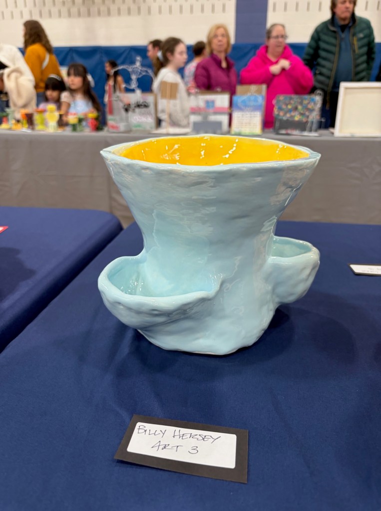 In the school gymnasium, student artwork was displayed for all to see in various styles. Among the exhibits were egg carton animals created by Cedar School kindergartners with Ms. Leanne Malfa, paper mache masks made by Mr. Aaron DiGaudio’s sixth grade art class, and the sophisticated ceramic pieces of the high school 3D art class. Featured as well were the expressive 2D and 3D art portfolios of the high school’s AP Art students, showcasing the artists’ dedication to creating meaningful thematic art.