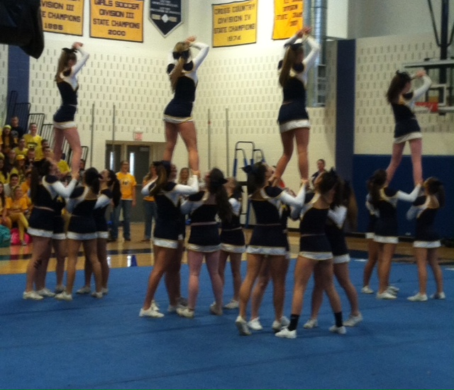 Leading up to their first competition on November 1st, the cheerleaders worked diligently on perfecting their skills and routine. Running a routine full-out is not something to take lightly; after nearly two minutes of vigorously clenching your muscles, forcefully yelling a cheer, running and tumbling across the mat, tossing girls your own age into the air, all while maintaining a megawatt smile, it truly takes a toll on you. Especially when you have to run that routine over and over and over until your bones are aching, your throat is sore, and your muscles are numb. But after a tough week of intense practices, the team arrived at their inaugural competition feeling confident and prepared.