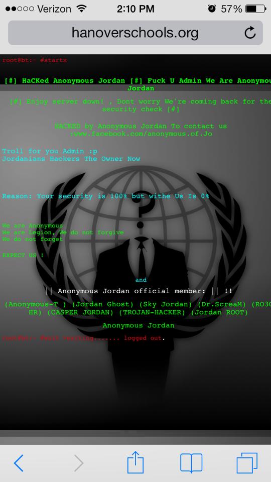 The website hacker claimed to be Anonymous Jordan, who has tackled some other websites in its conquests as well. Anonymous Jordan can be found on Facebook and Twitter, wearing the mask from the movie V for Vendetta in each profile picture. This “Jordan” appears to be based out of the country Jordan. However, because this hacker tackles things quite a bit bigger than the Hanover Schools website, I think it can be assumed that our “Jordan” is some sort of a copycat. The original Anonymous Jordan is a kind of vigilante. For example, recently he hacked the website of the United Nations for ignoring Palestinian hunger strikes. “Jordan” did this in order to draw attention toward the fate of these hunger strikers, several of whom are dying. After this major takeover, the Anonymous Jordan twitter page vindicated its actions and posted, “because ignorance is not bliss.” Additionally, they hacked the official website of Jordan’s prime minister. On this page, they left a message reading, “Hi uncle, how are you? We are sorry, we hacked your website. Are you upset? We feel much worse when you raise prices. The people know this feeling but you do not.” It seems as if this hacking group is providing a voice to those under persecution.